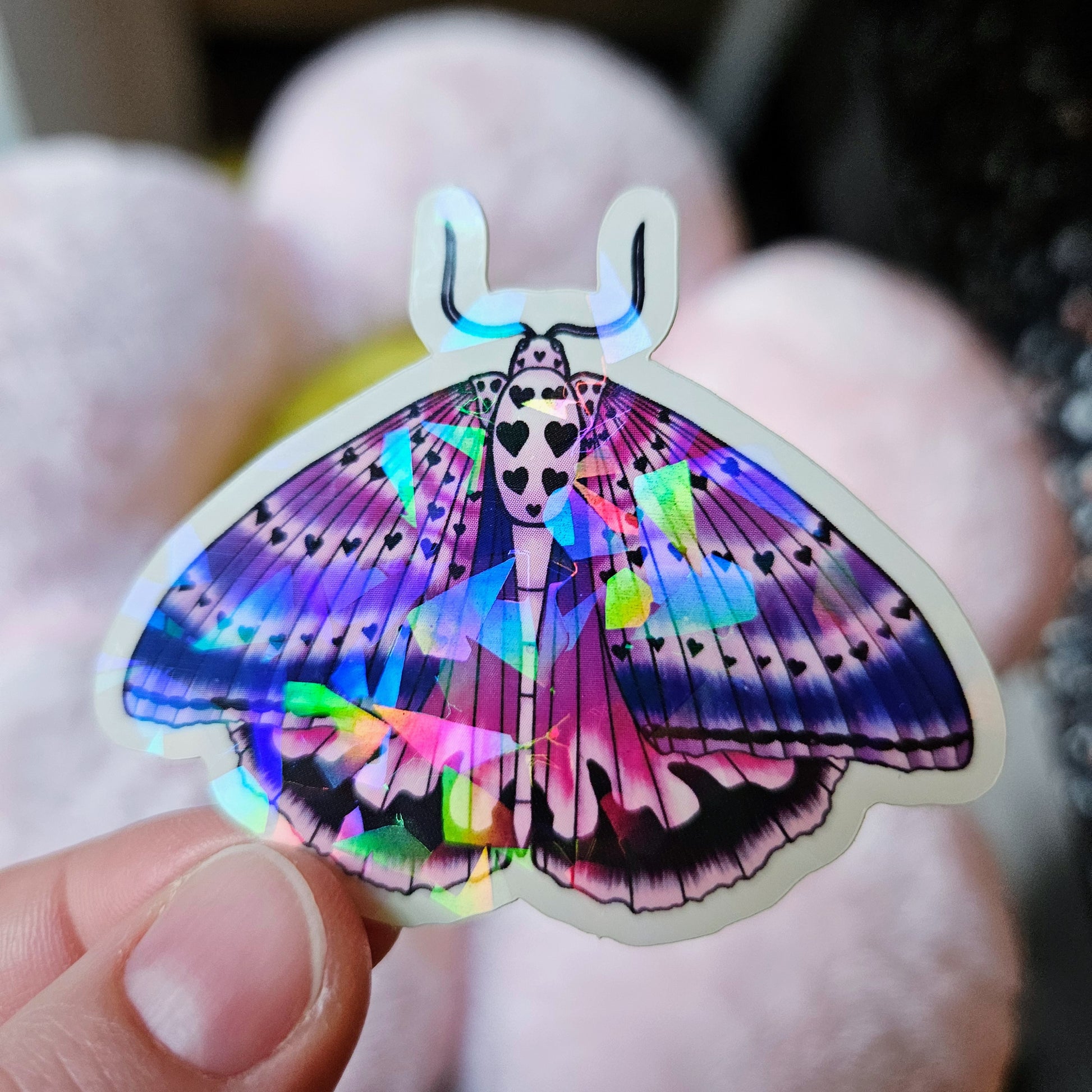 2.5" bella moth, bi pride flag sticker with holographic ice finish. Water and weather resistant.